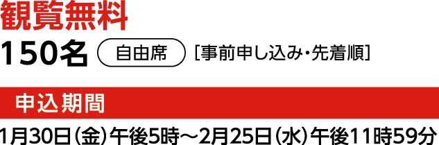 | 定員 | ★事前申し込み・先着順 150名(自由席) ※お申込みに際しては、下記の留意事項を必ずお読みください。 |
